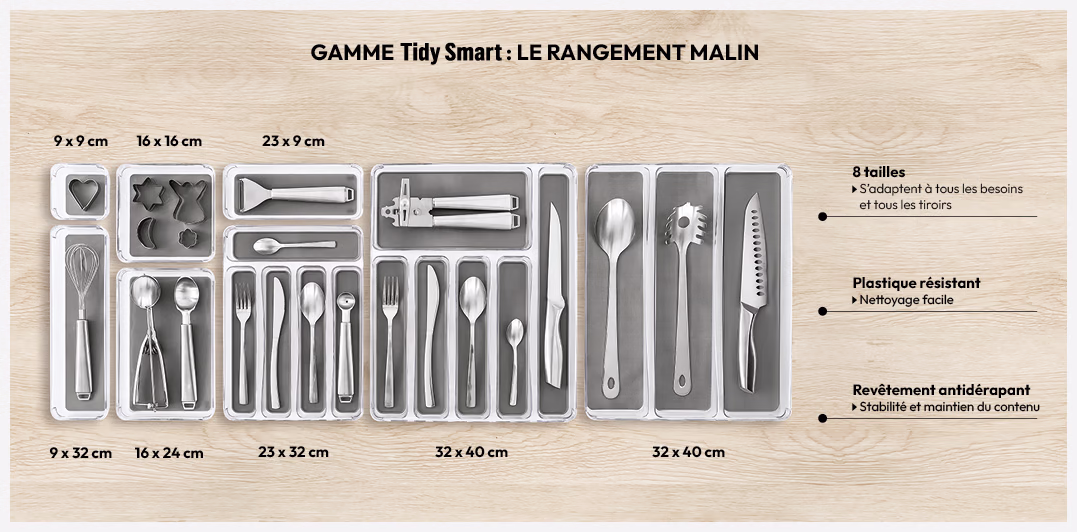 Mantén el orden en tus cajones con estos organizadores inteligentes de PET (poliéster reciclable), disponibles en 6 tallas diferentes para adaptarse a todas tus necesidades. Fabricados en plástico resistente y duradero, son ideales para organizar cubiertos en la cocina, accesorios en el baño o material de oficina en el escritorio.